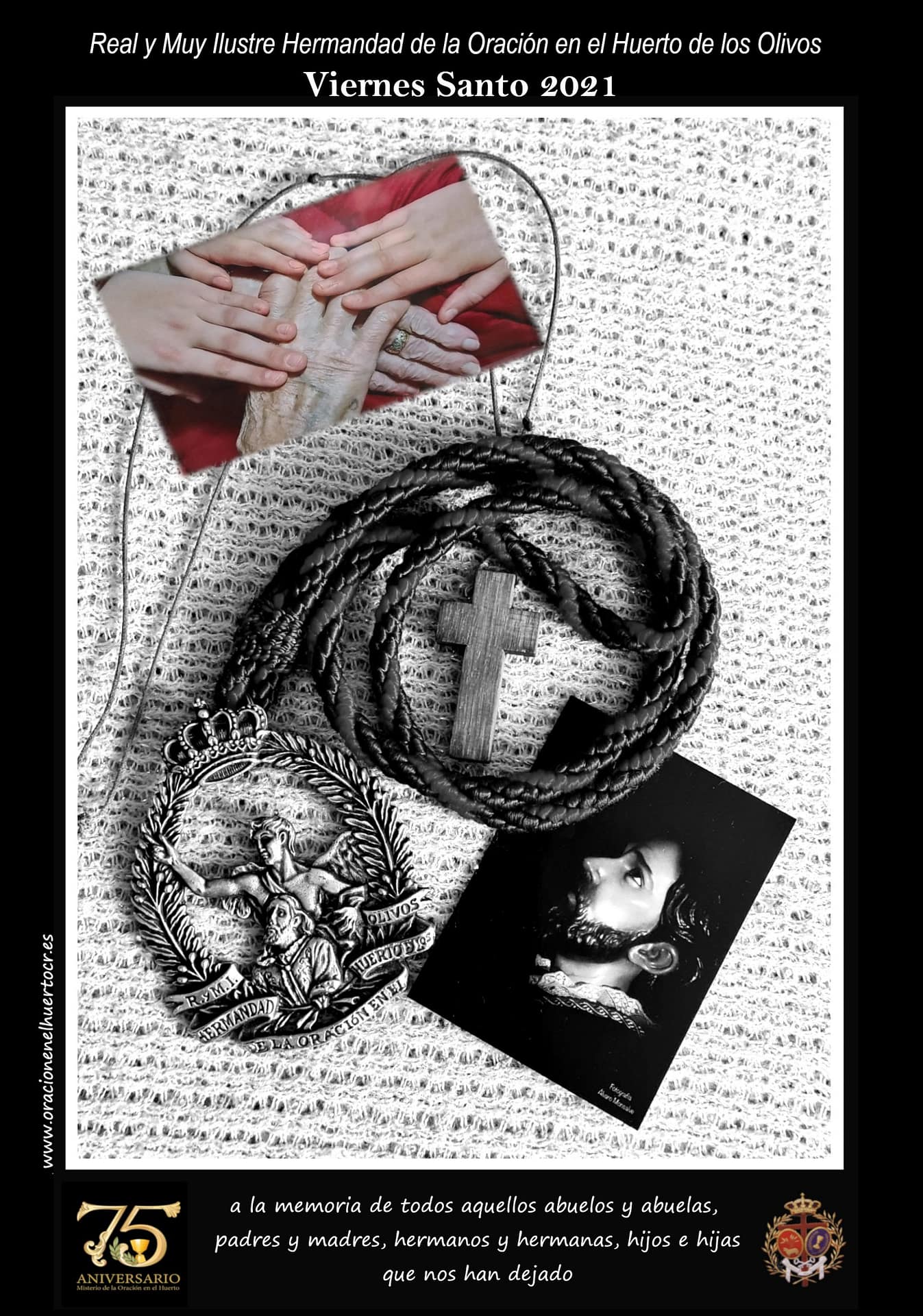 Es un cartel en blanco y negro, representando el luto por tantos familiares y amigos como hemos perdido en esta situación de pandemia. En él, se resaltan en color los emblemas de la hermandad y una fotografía muy entrañable, que es el foco de atención del cartel, en la que aparecen las manos de un hombre y una mujer de avanzada edad (tristemente el hombre ya no se encuentra entre nosotros), sobre las que se superponen las manos de tres niñas, que representan la esperanza, el futuro, la vuelta a la vida que hemos de retomar después de que todo esto pase.