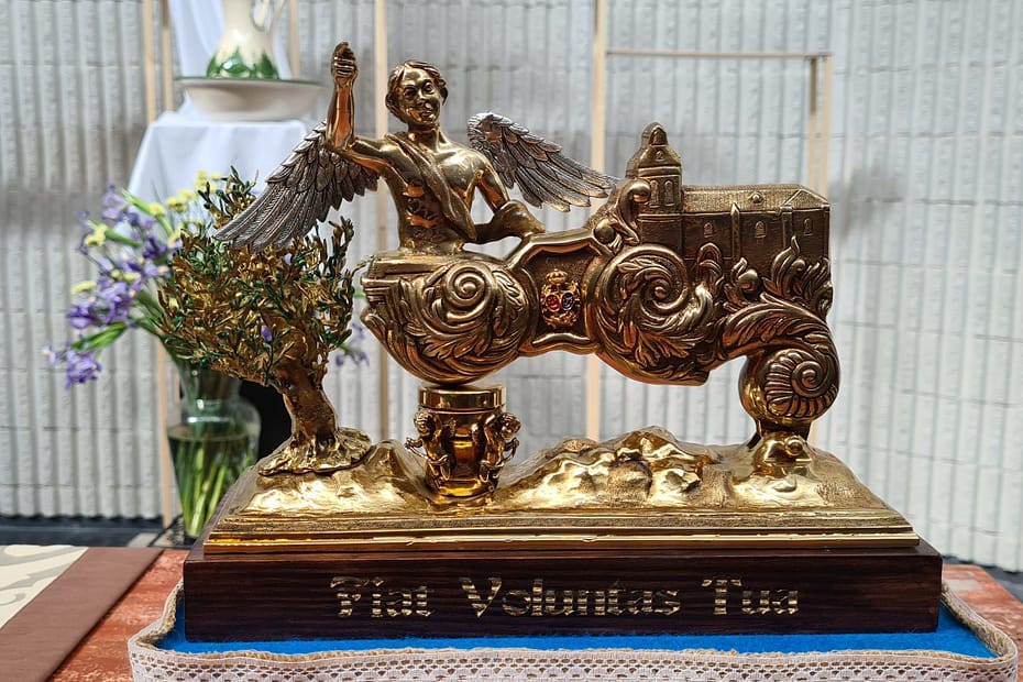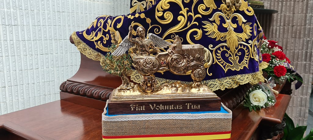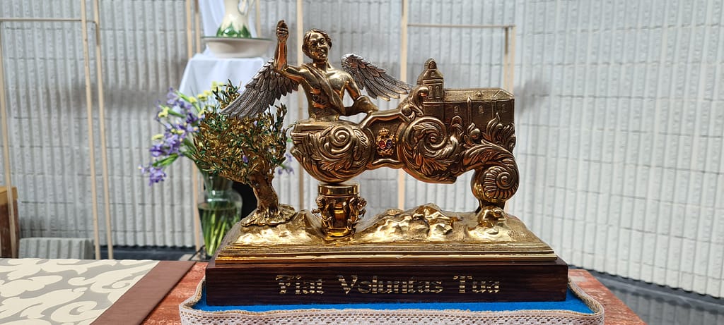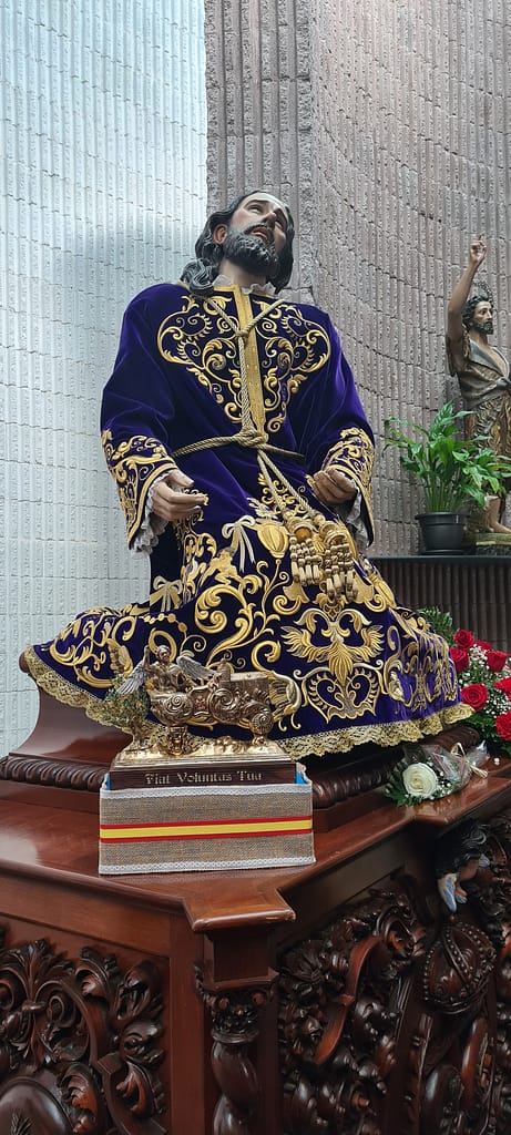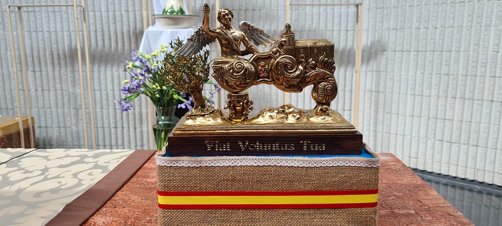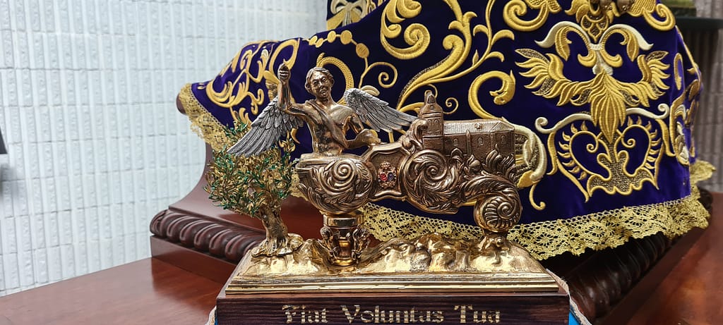 Completa la frase anterior, la inscripción de la peana, hecha ésta última, en madera, y barnizada en tonos caoba, conteniendo una inscripción en bajo relieve rematada con reflejos de oro que reza en latín: «Fiat Voluntas Tua», es decir «Hágase Tú voluntad».