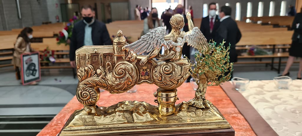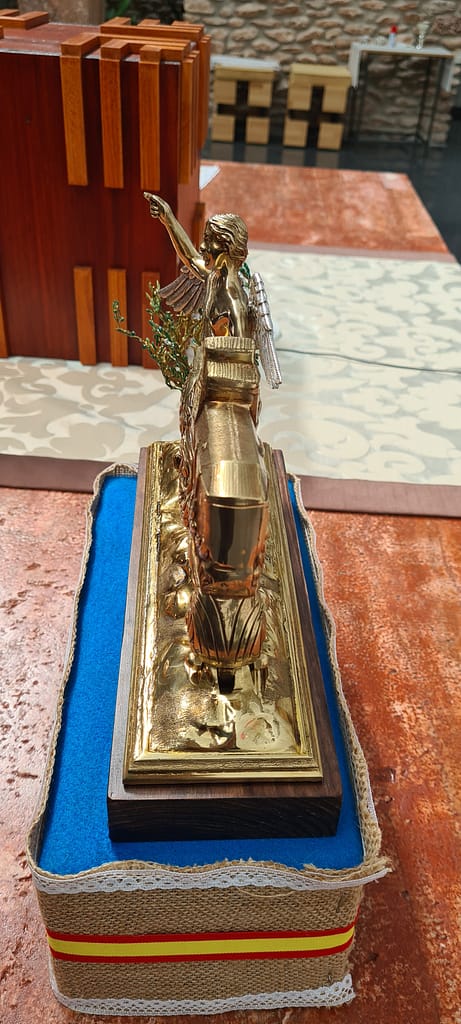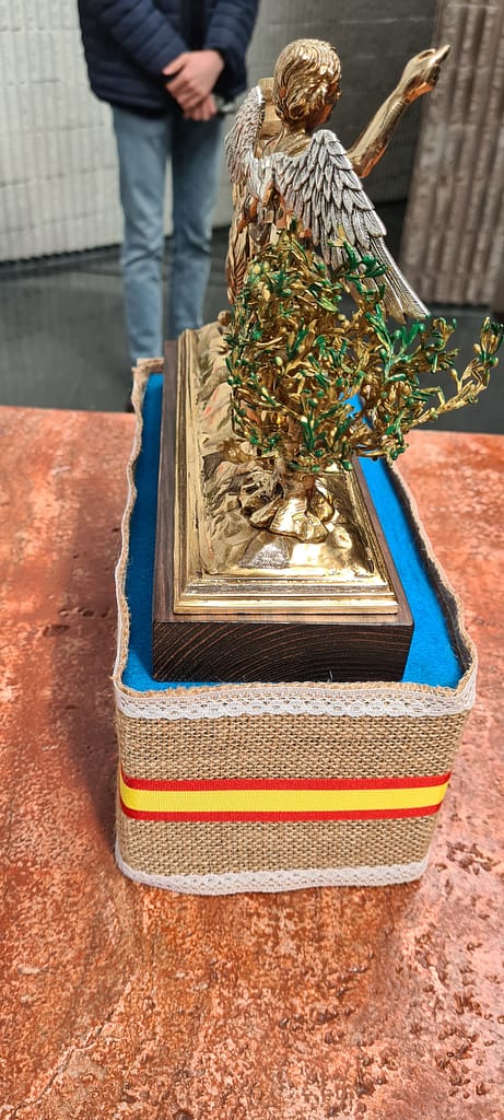 Diseñado sobre bronce, es una réplica a dos caras de la Iglesia de San Pedro de Ciudad Real, Sede Canónica de nuestra Hermandad y templo desde el cual realizamos Estación de Penitencia la mañana del Viernes Santo.