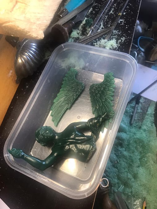 Fotografía detalle: diseño previo en cera del Ángel Confortador, llevado a cabo por el burilista antes de su fundición por el orfebre.