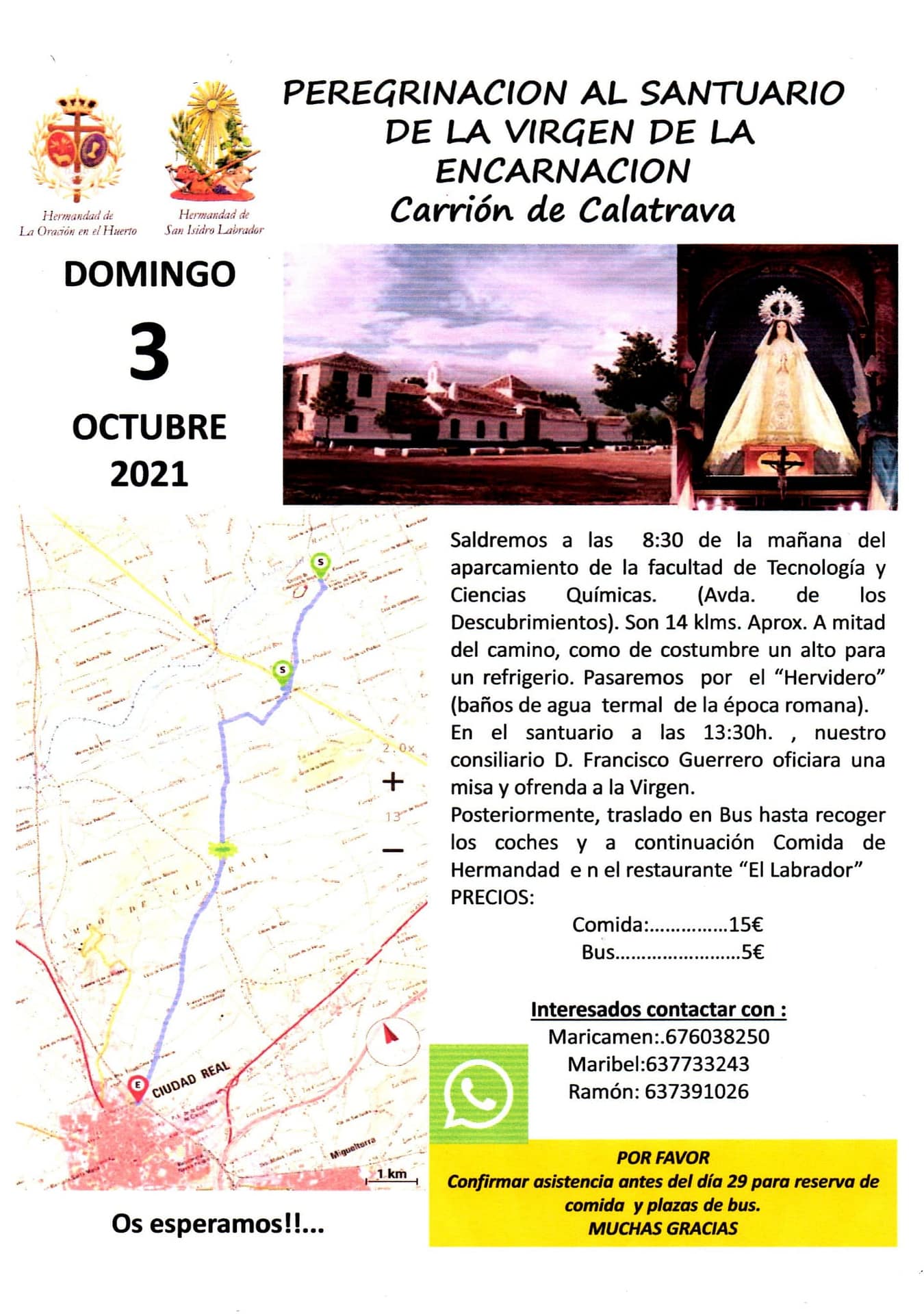 Un recorrido sólo de ida, desde Ciudad Real, hasta el Santuario de la Virgen, en Carrión, de unos 14 Kms aproximadamente, en cuyo discurrir, pasaremos entre otros parajes, por el «Hervidero» (baños de agua termal de época romana). La vuelta podrá realizarse en autobús, previo pago de la reserva del mismo, o bien cada peregrino/a por sus propios medios.