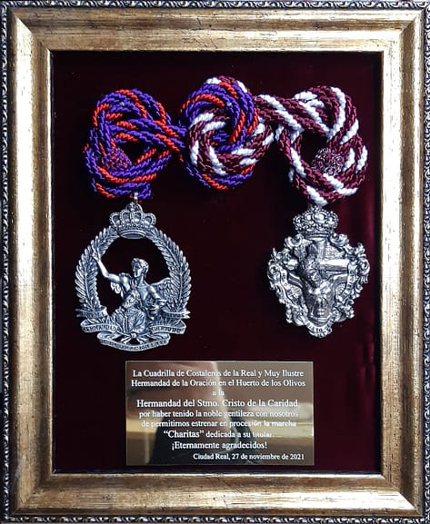 Pocos saben, que la reconstitución de las hermandades del Huerto y del Cristo de la Caridad, tienen un origen común tras la Guerra Civil Española, y es que ambas hermandades fueron reorganizadas en parte, por los agricultores de nuestra localidad. Fruto de ese origen «común», el simbolismo que representa el reconocimiento entregado, donde ambas medallas entremezclan sus «cordones».