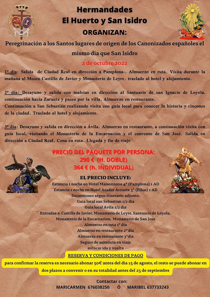Las Juntas de Gobierno, de las hermandades del Huerto y San Isidro, organizan conjuntamente, para el próximo día 2 de octubre, una peregrinación a los santos lugares de origen, de aquellos españoles, canonizados el mismo día que San Isidro Labrador.