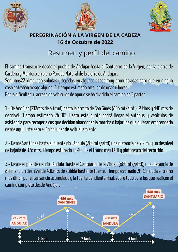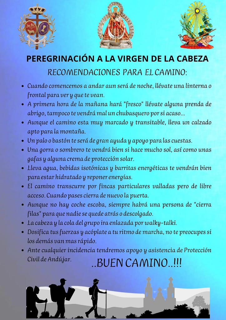 Para aquellos que os animéis a peregrinar con nosotros al Santuario de la Virgen de la Cabeza el próximo domingo 16 de octubre, aquí os dejamos tanto el Perfil de la Peregrinación, como algunos Consejos Útiles que os pueden venir bien para acometer el recorrido.