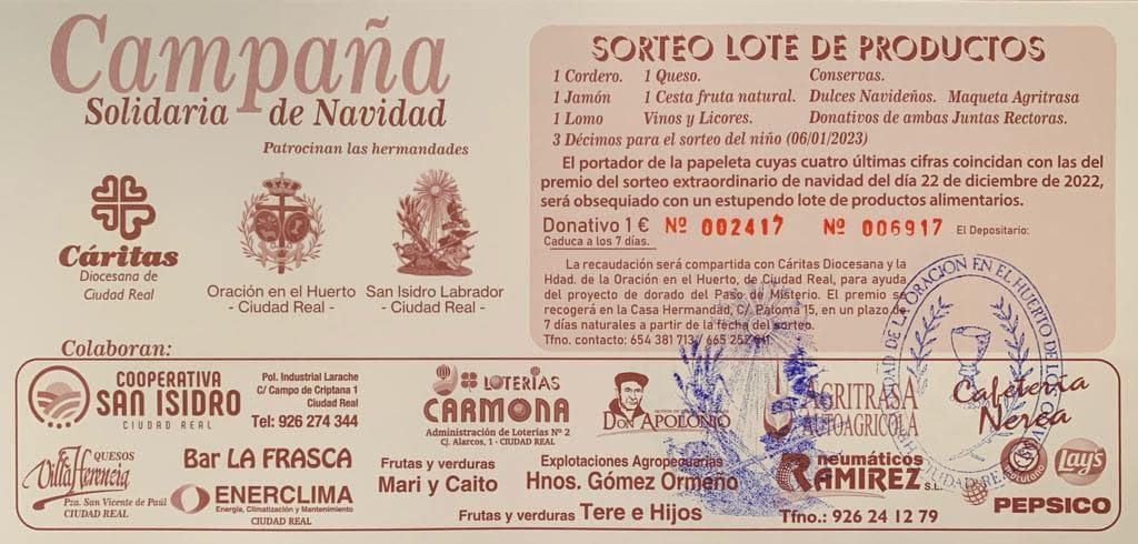 El portador de la papeleta cuyas cuatro últimas cifras coincidan con las del premio del sorteo extraordinario de navidad del día 22 de diciembre de 2022, será obsequiado con un estupendo lote de productos alimenticios, décimos de lotería del niño, un cordero, etc.