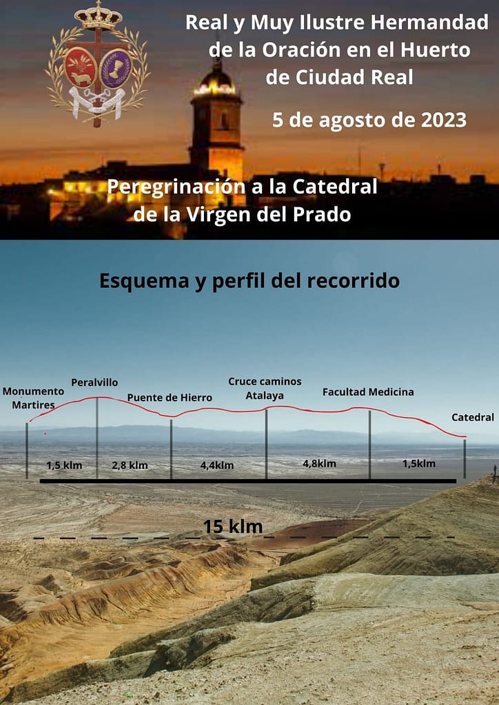 El punto de encuentro está fijado a las 0:00 horas en el Hotel Cumbria (situado en la carretera de Toledo) para desde allí, partir en coche hasta la Cruz de los Mártires. A la 1:00 horas el grupo comenzará el camino, pasando Peralvillo, hasta llegar al Puente de Hierro donde se hará una pequeña parada. A continuación, la peregrinación transcurrirá por los Caminos del Quijote hasta llegar a la facultad de medicina, cruzando el campus universitario y tomando la calle Calatrava que nos conducirá hasta el Prado, donde veneraremos y rezaremos ante la Virgen del Prado, haciendo entrega de la credencial del peregrino, la cual pone a disposición de todos los caminantes que se inscriban antes del día 5 de agosto la Ilustre Hermandad de la Virgen Del Prado, y que tramitaremos desde la hermandad. Para concluir, a las 6:00 horas participaremos en la Santa Misa del Peregrino. Aquí os dejamos el perfil del recorrido de la Peregrinación.