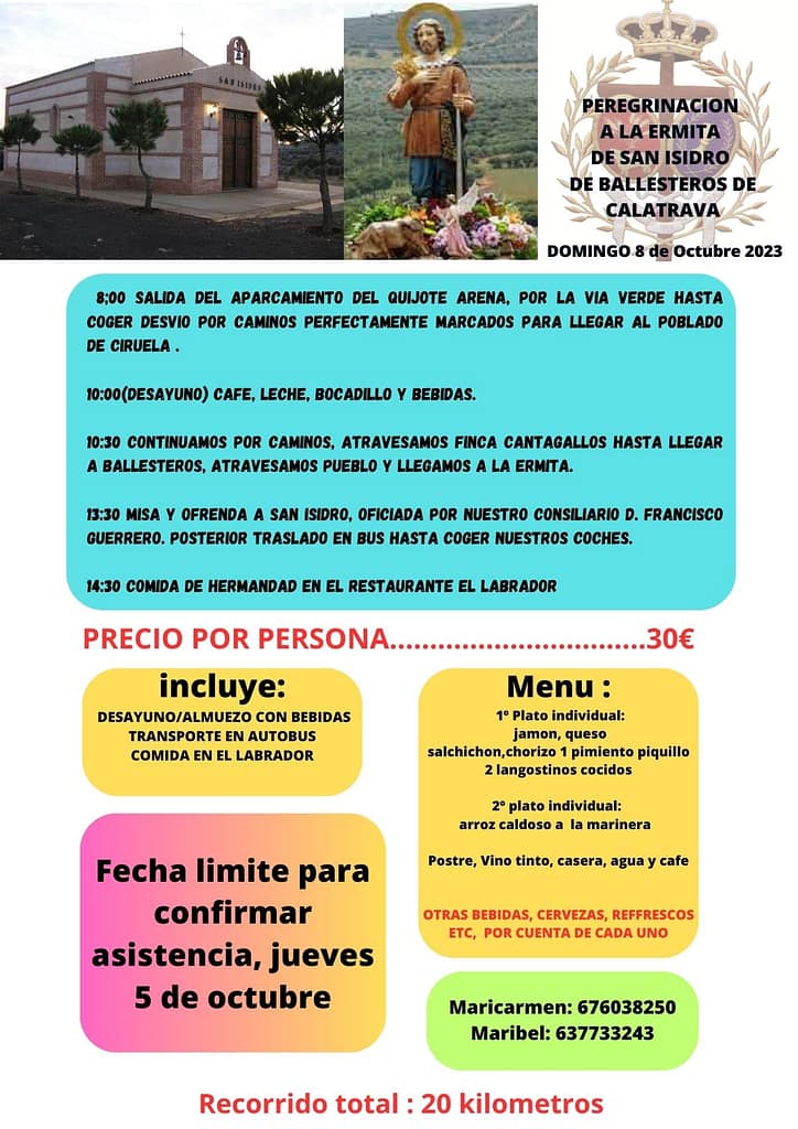 La ruta consta de 20 kilómetros, transcurriendo por caminos cómodos y accesibles. A las 8:00 horas está prevista la salida desde el aparcamiento del Quijote Arena, tomando la Vía Verde para llegar al poblado de Ciruela donde se hará una parada para desayunar. Tras la pequeña parada, continuaremos la travesía, hasta llegar hasta la Ermita de San Isidro, donde realizaremos una ofrenda y celebraremos una misa oficiada por nuestro consiliario Don Francisco Guerrero González. Posteriormente a las 14:30 tendremos la comida de hermandad en el restaurante El Labrador. El precio por persona es de 30 euros.