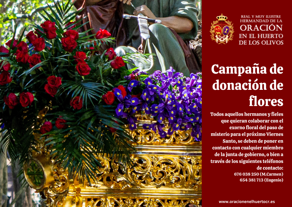 Todos los hermanos y fieles que quieran colaborar con el exorno floral del paso de misterio para el próximo Viernes Santo, se deben de poner en contacto con cualquier miembro de la junta de gobierno, o bien a través de los siguientes teléfonos de contacto: 676 038 250 (M.Carmen) o 654 381 713 (Eugenio).