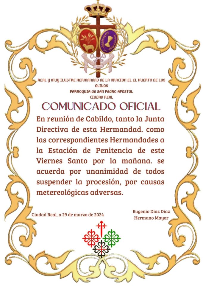 Suspensión de la Estación de Penitencia29/03/202429/03/2024 Compartir:Haz clic para compartir en WhatsApp (Se abre en una ventana nueva)Haz clic para compartir en Facebook (Se abre en una ventana nueva)Haz clic para compartir en Twitter (Se abre en una ventana nueva)Haz clic para imprimir (Se abre en una ventana nueva)