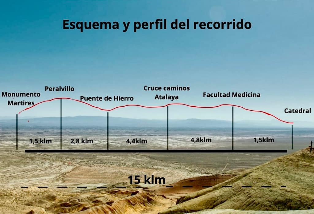 El punto de encuentro de los peregrinos está fijado a las 0:30 horas en las inmediaciones de la Cruz de los Mártires, situada en la carretera N-401, pasando el “Club Deportivo El Pielago” y antes de llegar a Peralvillo.. A la 1:00 horas el grupo comenzará el camino, pasando Peralvillo, hasta llegar al Puente de Hierro donde se hará una pequeña parada. A continuación, la peregrinación transcurrirá por los Caminos del Quijote hasta llegar a la facultad de medicina, cruzando el campus universitario y tomando la calle Calatrava que nos conducirá hasta el Prado, donde veneraremos y rezaremos ante la Virgen del Prado. A la llegada del grupo de peregrinos a la S.I.P.B. Catedral, se hará entrega de la credencial del peregrino a aquellos hermanos que realicen el camino por primera vez. Los hermanos que peregrinaron el pasado año o anteriores, deberán llevar la credencial para poder sellarle el presente año. A las 6:00 horas, participaremos en la Santa Misa del Peregrino. Aquí os dejamos el perfil del recorrido de la Peregrinación.