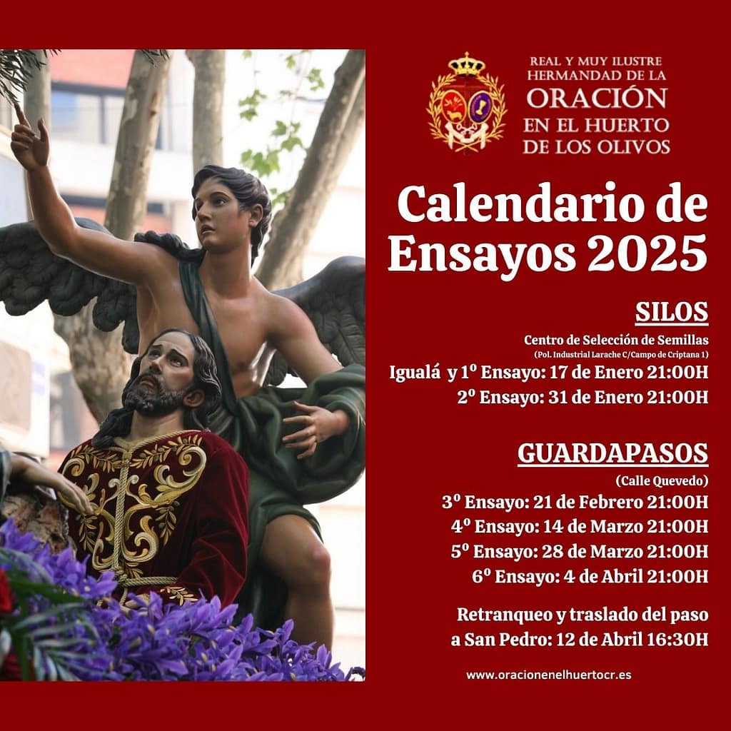 La Junta de Gobierno y el Equipo de Capataces hacen público el calendario de ensayos de la cuadrilla de costaleros, de cara al próximo y esperado Viernes Santo 2025, dando comienzo el 17 de enero con la igualá y primer ensayo a las 21:00 horas en los Silos del Polígono Industrial Larache (C/Campo de Criptana 1). Será imprescindible acudir con el calzado que se utilice en la procesión.