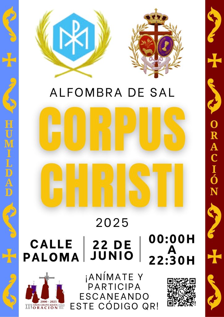 La próxima madrugada del 22 de junio, nuestra Hermandad y Grupo Joven realizará con nuestra querida Hermandad de Las Palmas de Ciudad Real una alfombra de sal con motivo de la Solemnidad del Corpus Christi.