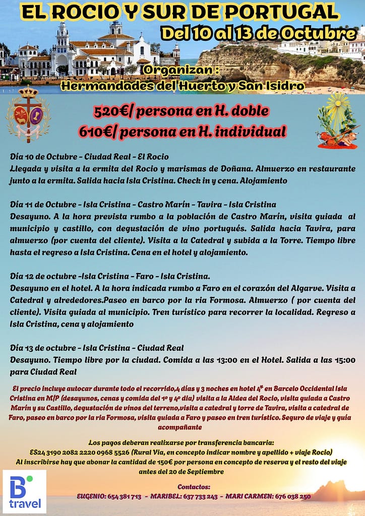 Los días del 10 al 13 de octubre la Hermandad viajará hasta la Aldea del Rocío y Sur de Portugal, visitando las ciudades de Castro Marín, Tavira y Faro.
