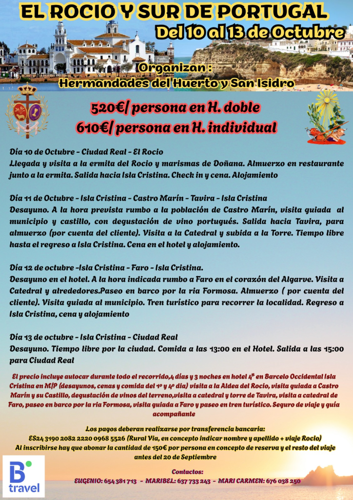 Los días del 10 al 13 de octubre la Hermandad viajará hasta la Aldea del Rocío y Sur de Portugal, visitando las ciudades de Castro Marín, Tavira y Faro.