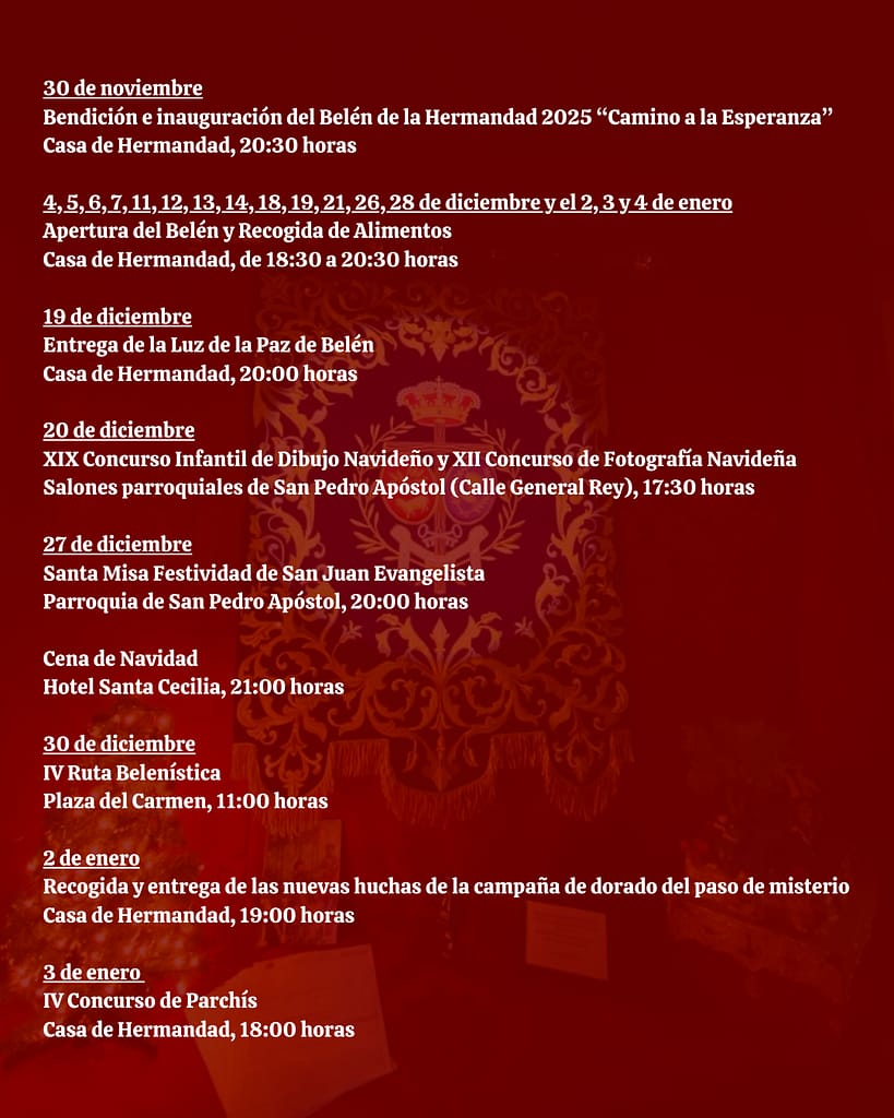 La Hermandad hace pública la programación para esta próxima Navidad, la cual abarca diferentes actividades, concursos y cultos, así como la campaña de caridad de recogida de alimentos, entre otros actos.