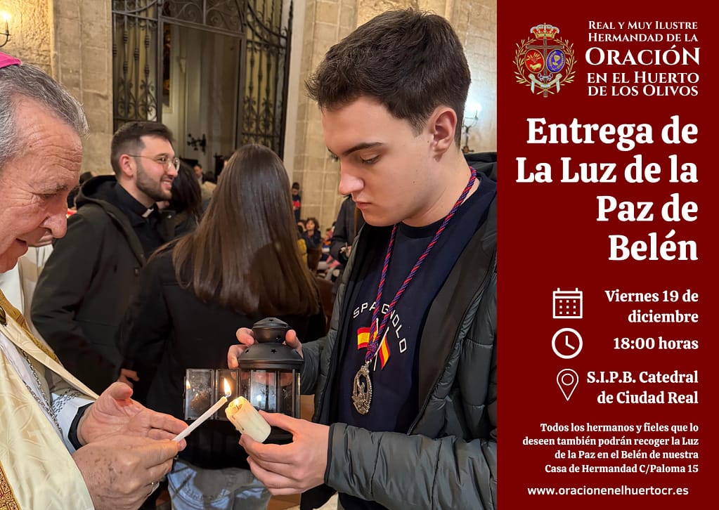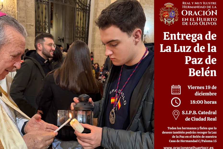 Mañana, viernes 19 de diciembre, como ya se anunció en la programación de actos de la Navidad, nuestra Hermandad asistirá y participará en la celebración de la entrega de la Luz de la Paz de Belén, que tendrá lugar en la S.I.P.B. Catedral a las 18:00 horas. Posteriormente, todos los hermanos y fieles que lo deseen también podrán recoger la Luz de la Paz en el Belén de nuestra Casa de Hermandad, calle Paloma 15.