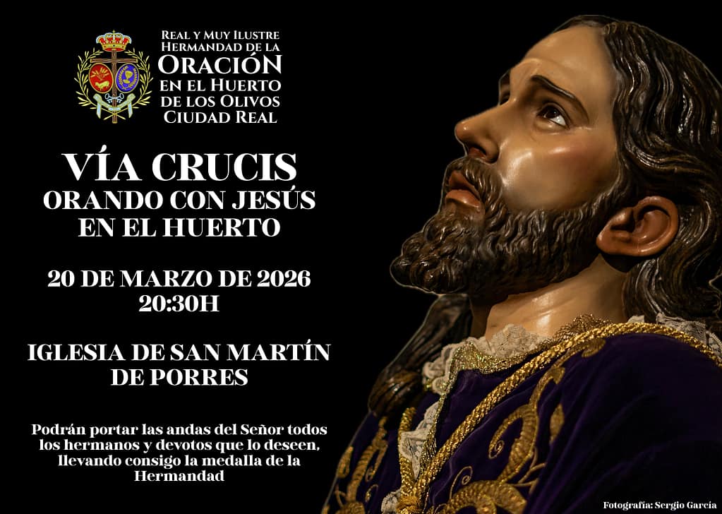 El próximo viernes 20 de marzo, tal y como se informó a los hermanos en el boletín cuaresmal, celebraremos a las 20:30 horas en la Iglesia de San Martín de Porres el Vía Crucis Orando con Jesús en el Huerto,
