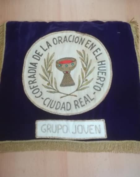 - Historia: En terciopelo morado bordado en oro con un óleo de Jesús orando con el ángel por las Religiosas Adoratrices de Ciudad Real en 1950