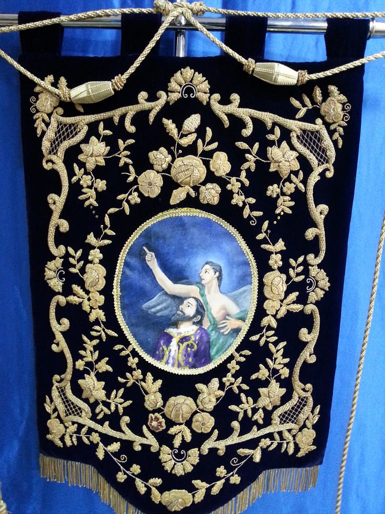 - Tipo: Estandarte, bordado en oro sobre terciopelo morado.