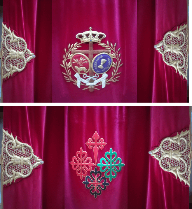 En terciopelo rojo con broches de oro y el escudo de la hermandad bordado en este mismo material por los talleres de García y Poo en el año 2001.