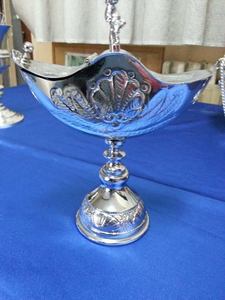 - Detalle: Metal plateado liso, con adornos