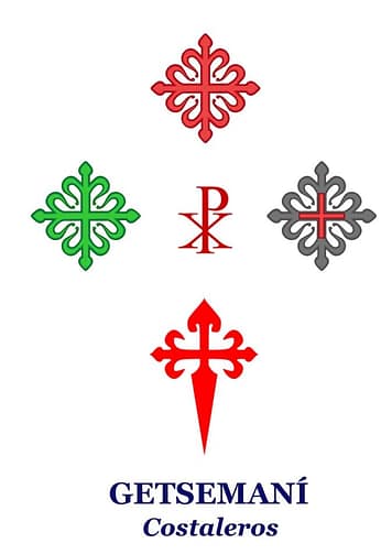 Detalle escudo con las cuatro órdenes militares que lucen los costaleros en la manga, con el Crismón en la parte central. Nuestra cuadrilla de costaleros, es pionera desde su fundación en el año 1983, en la imposición de una vestimenta uniforme y obligatoria para todos sus costaleros (en la Estación de Penitencia), y actualmente trabaja en una indumentaria común de cara a los ensayos (opcional).
