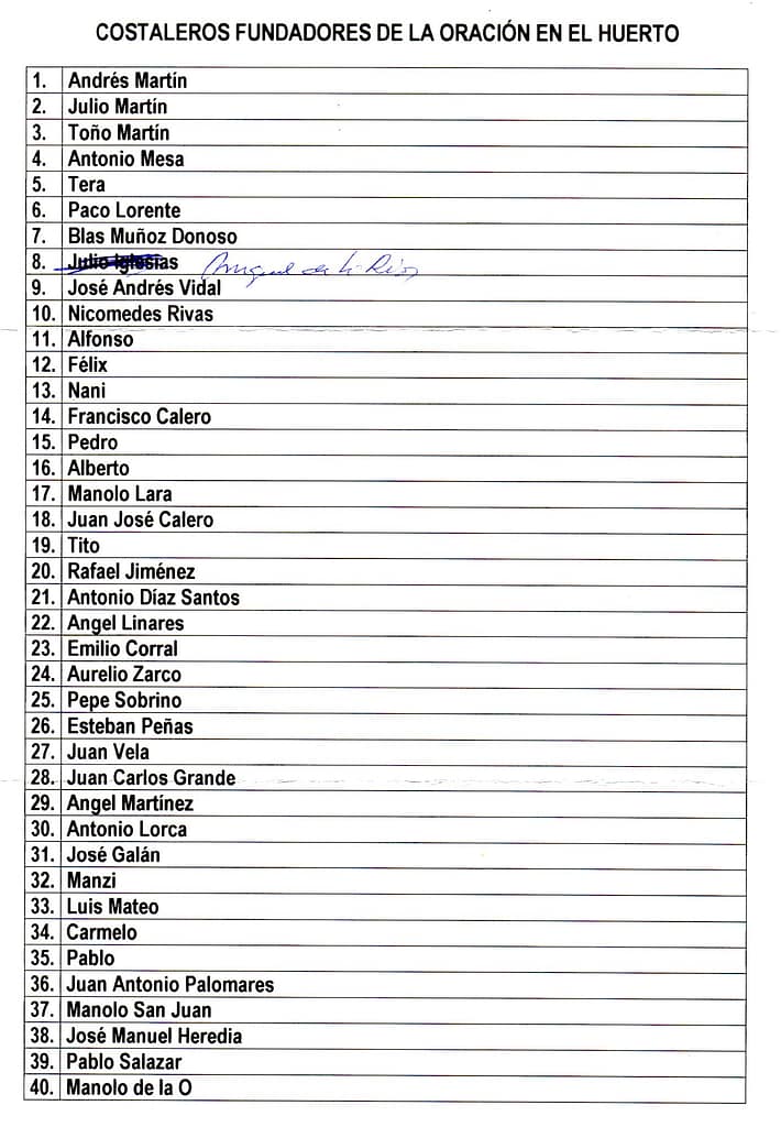<<De la anterior lista muchos vienen solamente por el nombre o el apodo, pues no se les tomó los datos exactos. La primera conversación con la Junta Directiva, la tuvimos Javier González Yubero, Antonio Señas y yo (Manuel Lucendo). En esta conversación el proyecto salió adelante gracias a Ti, pues aunque nadie de la Junta Directiva estaba muy conforme, confiaron en tú decisión, con la única excepción de uno (del que no recuerdo el nombre, pero sí recuerdo su cara, incluso ahora cuando me lo cruzo por la calle) que se opuso "enérgicamente". El primer capataz lo fue Javier González Yubero. Especial consideración hacia (Manuel) Manolo Martín Rivas (hermano de Andrés), que el Domingo de Resurrección de ese primer año, al no estar presente el que fue primer capataz, lo llevo como capataz hasta el almacén de Pio XII. También especial consideración hacia Antonio Señas, que fue el que me animó a plantearlo ante la Junta Directiva, y también fue el que diseñó las parihuelas. Aún cuando yo se lo propuse no quiso ser el Capataz.>>