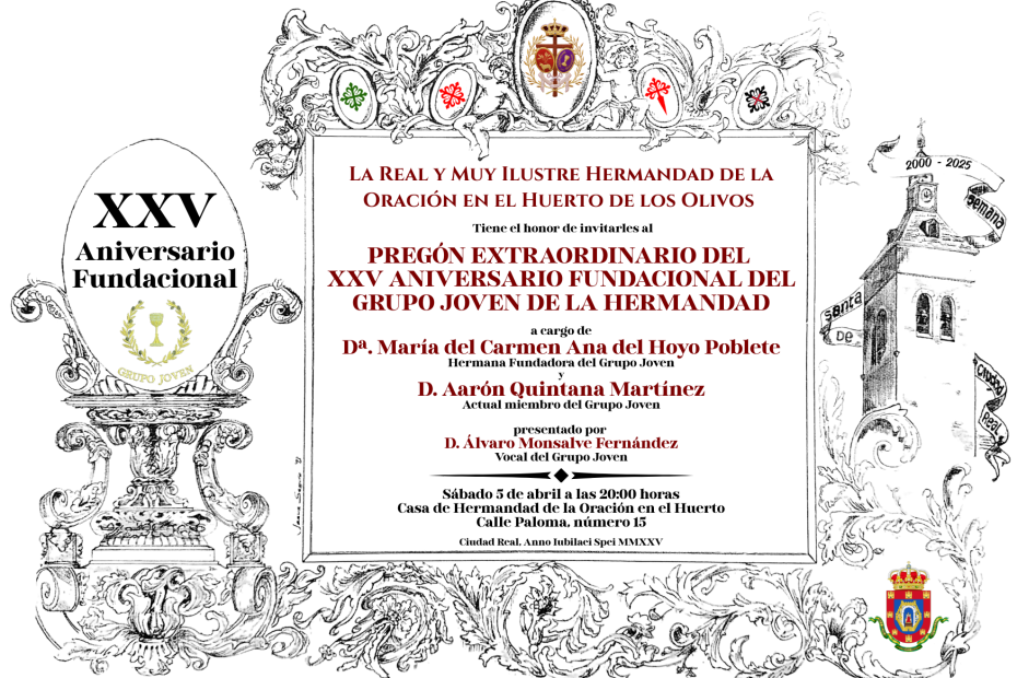 Mañana, sábado 5 de abril a las 20:00 horas, nuestra Casa de Hermandad acogerá el Pregón Extraordinario del XXV Aniversario Fundacional del Grupo Joven de… Leer más »PREGÓN EXTRAORDINARIO DEL XXV ANIVERSARIO FUNDACIONAL DEL GRUPO JOVEN