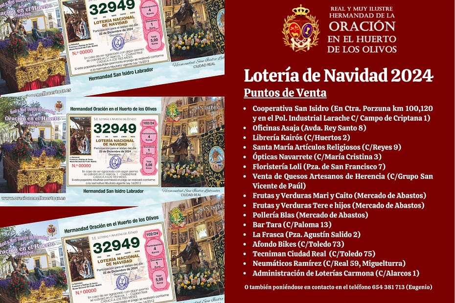 Un año más, la Hermandad de La Oración en el Huerto de los Olivos y la Hermandad de San Isidro Labrador, ponen a la venta… Leer más »Lotería de Navidad 2024
