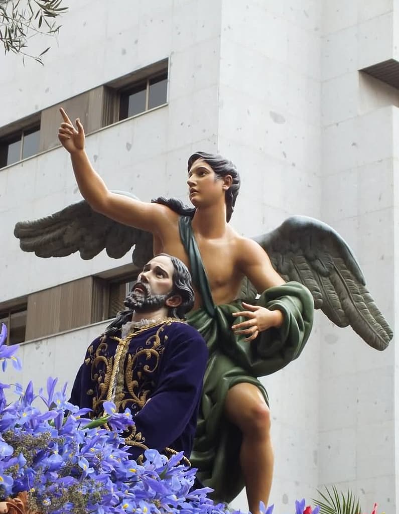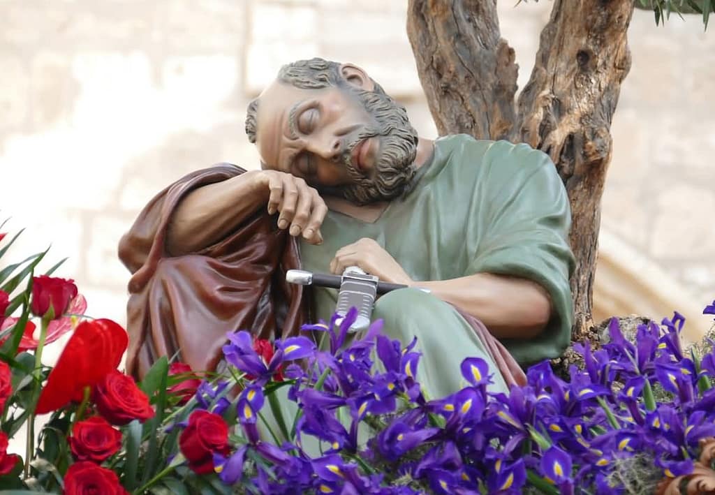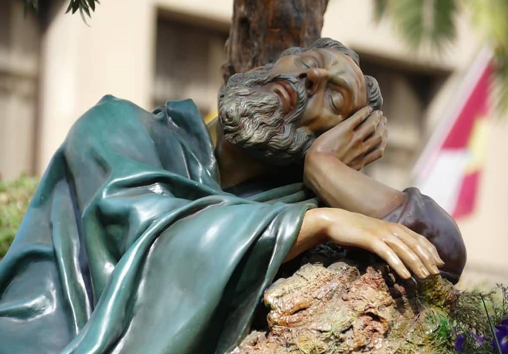 De Interés: Todas las imágenes eran de talla completa. El Ángel, según D. Julián Alonso, era un «angelote guapo, adolescente, confortador, sostenía con una mano la cabeza desfallecida de Jesús, y con la otra le mostraba el cáliz de la tribulación, que descendía entre las ramas de ponderado olivo. Los tres apóstoles elegidos dormían en armoniosa combinación de figuras, completando el bello conjunto».